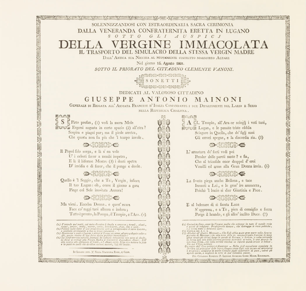 Dieses 1960 publizierte Weihnachtsgeschenk ist eine vertiefte Analyse der Figur von General Mainoni, verfasst von Abt Louis Delcros. In seinem Bericht finden sich zahlreiche Seiten über Fakten und Begebenheiten, die sich in Lugano zugetragen haben. Dies entspricht der Absicht der Cornèr Bank, der Öffentlichkeit aussergewöhnliche Geschichten und Bücher näher zu bringen.